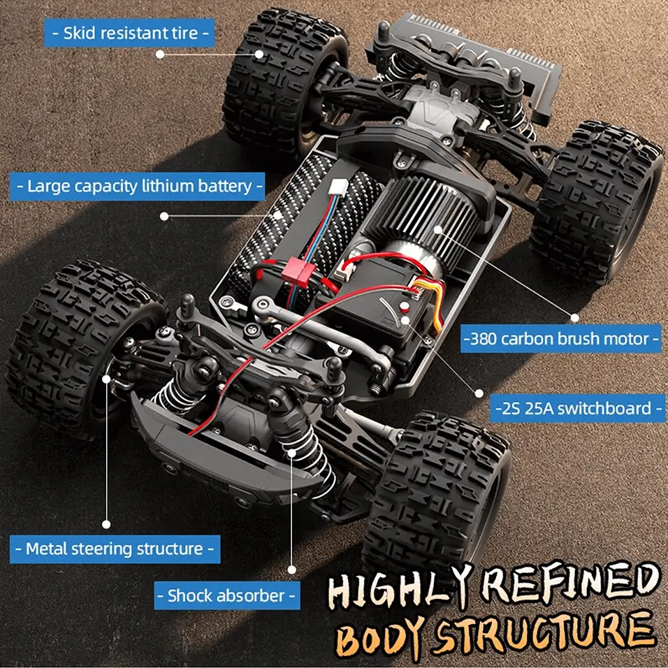 1. It adopts simulation structure design, has the control feeling of real car, realizes full-proportional stepless speed change, high-speed driving, sudden acceleration, deceleration, braking, reversing, left turn, right turn